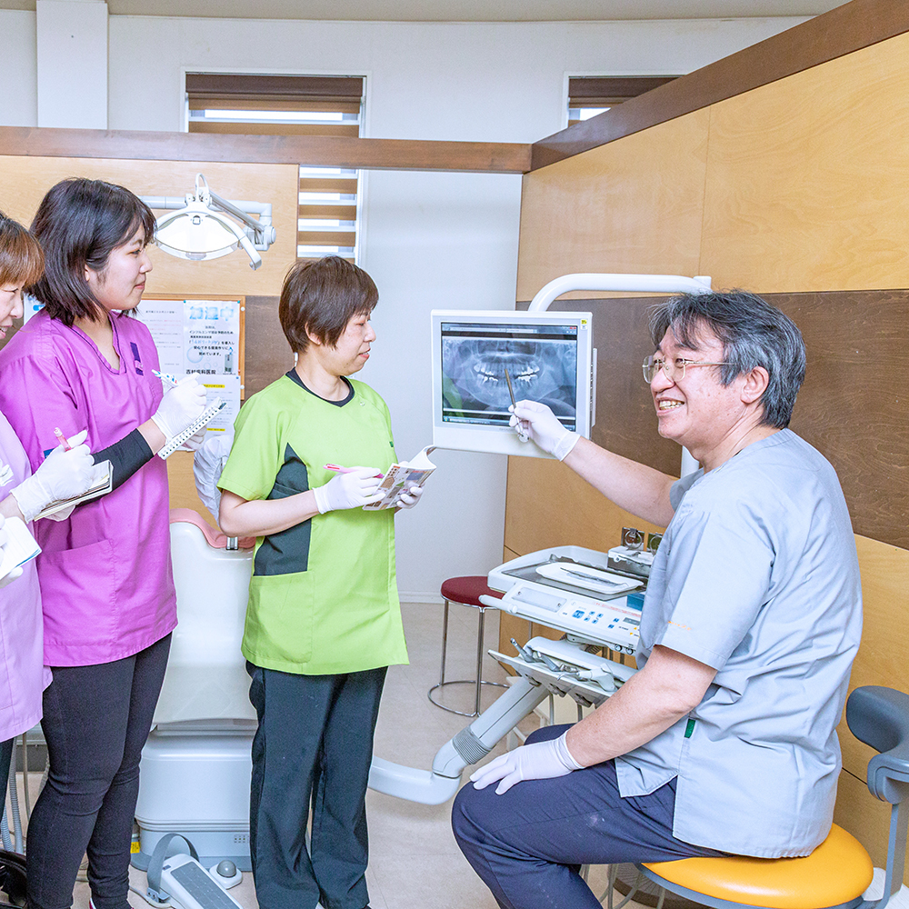 私どもはスタッフのスキルアップを応援しています。月1回、診療時間内に1時間程度の勉強会を開催。スタッフが希望し医院が認定した研修や、医院指定の研修にかかる費用・交通費は全額負担いたします。
